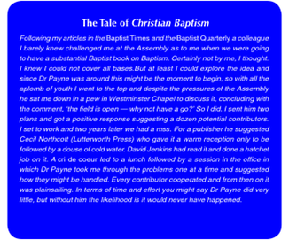 Neither a public speaker nor a charismatic character, leadership to him was spotting what was needed followed by encouragement and support for others who were ready to do it, as ‘The Tale of Christian Baptism’ (on the next page) demonstrates. Without his understandlng and support it may never have seen the light of day, nor was this the only door he opened for me, nor was I the only one to have this experience. To work with him, and alongside him, was an inestimable privilege.