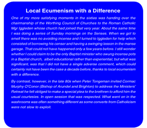 In some respects the Council had a touch of the Shareholders’ Meeting about it — programmes, problems and prospects, either for approval or support, plus all the Committees and a fair number of ‘Shakespeare’s babes’ (now fully grown) reporting on their work. It was mostly legalistic and practical, with little opportunity for serious debate of issues, imagination or creativity. (Any Baptist student seeking a research topic might consider a survey of Council Agendas to compare with today).
