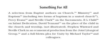 59 Michael H Taylor (ed), Baptists for Unity, 1968, with contributions from Paul Rowntree Clifford, Robert Brown, Peter Coleman, Roger Nunn and Donald Smith.